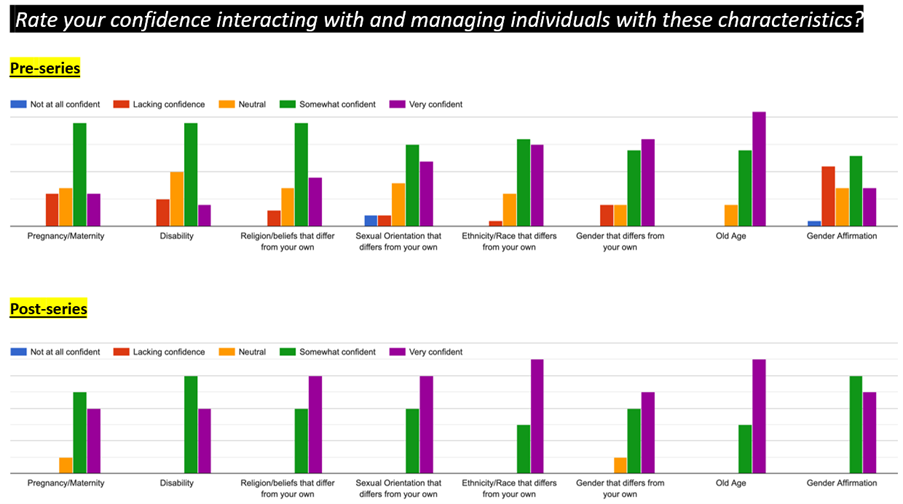 Figure 1: Self-assessed confidence ratings regarding interacting with individuals with protected characteristics, both before and after the delivery of this teaching series